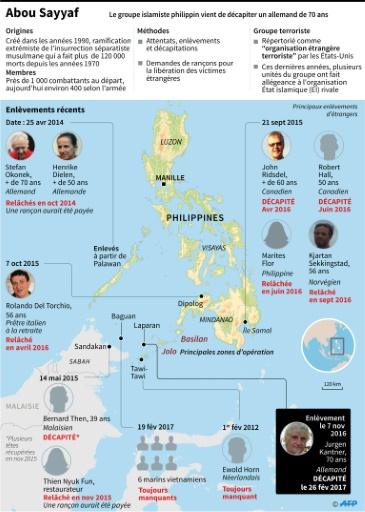 « Après avoir exigé le versement d’une rançon de 30 millions de pesos (560 000 euros), en février 2017, le groupe décapite un nouvel otage allemand, Jürgen Kantner, âgé de 70 ans, enlevé l’année précédente dans le sud des Philippines, alors qu’il naviguait sur son voilier avec sa compagne, Sabine Merz, retrouvée tuée par balle à bord du bateau36.